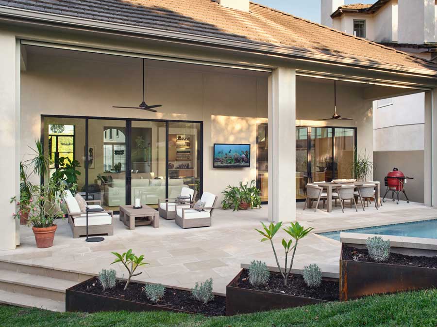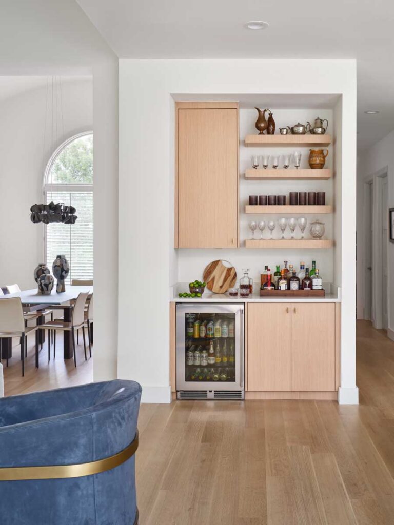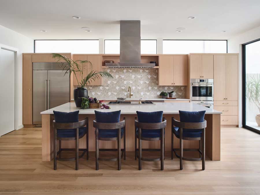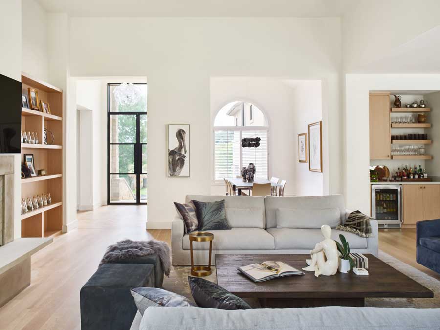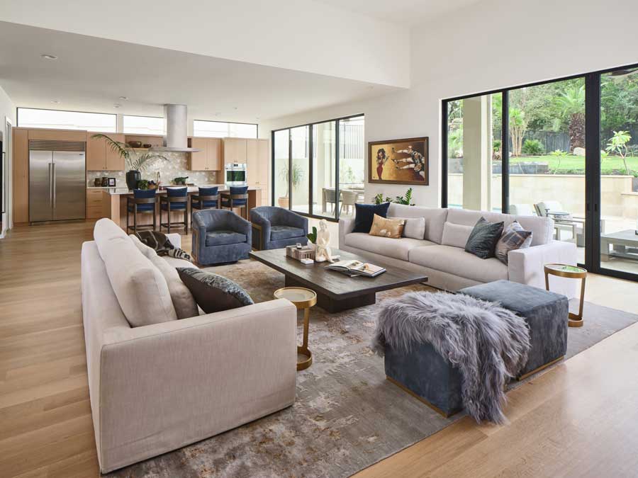 This couple took a dated chopped up land constrained home from the early 2000’s and knocked it out of the park. They relied on the architect to pull off some razzle dazzle by moving the kitchen from one end of the house to the other, removed one massive structural wall, and sacrificed 200 sq ft for a larger patio and pool. They brightened up the room by adding 32′ of glass on the back, a new front door and clearstory windows above the kitchen cabinets. It was a dream come true and it all started with a desire to downsize during the pandemic.